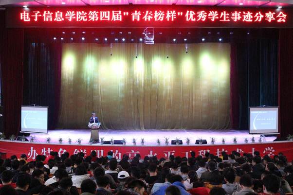 为宣传先进,树立典型,用身边榜样的力量激励和引领广大学生勤奋学习,奋发有为,励志成才,11月28日下午,电子信息学院在学术报告厅举行第四届“青春榜样”优秀学生事迹分享会,学校素质教育中心副主任邹春霞老师及电子信息学院领导、辅导员及全体同学参加了此次分享会。