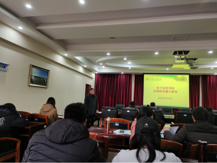 为进一步加强新时代师德师风建设,落实立德树人根本任务,增强全体教职工的责任感、使命感、荣誉感,规范教师履职尽责的行为,引导广大教师争做“四有”好老师,2020年12月23日,电子信息学院院长何世彪在第七会议室对全院教职员工进行了师德师风警示专题教育。