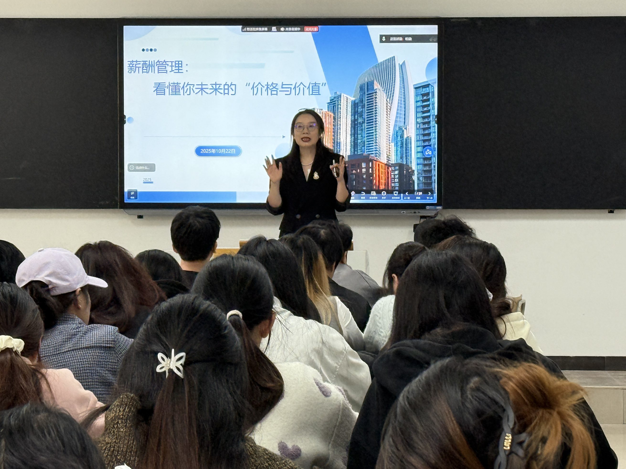本报讯(图/文 肖鸿艳)在人才竞争白热化的当下,薪酬管理已从传统的“发工资”升级为“留人才、激活力”的核心工具。数字经济与管理学院人力资源系特邀请到拥有27年人力资源管理经验的协信星光商业管理有限公司人力资源行政总监秦利琼老师,于2025年10月22日在南泉校区第六教学楼117举办了题为“看懂你未来的‘价值与价格’”讲座活动,近100名师生参与此次活动。