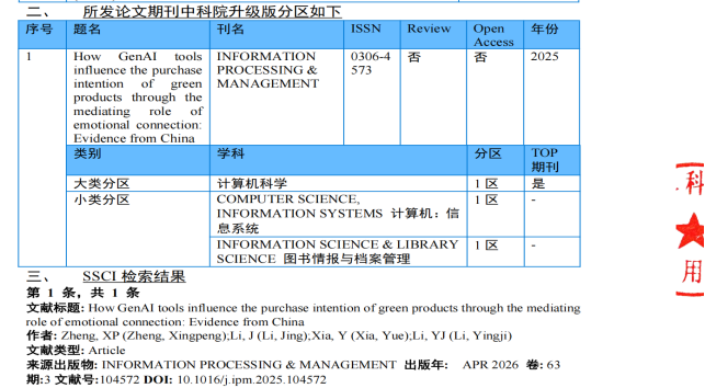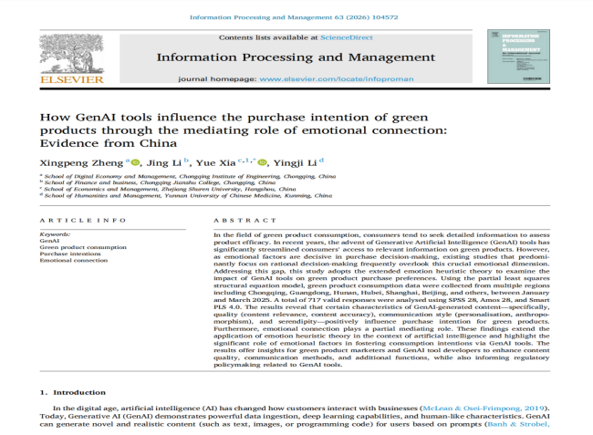 本网讯(图/文 汪俊良、李玲、郑兴棚)17日,我院的郑兴棚副教授在中国科学院一区top期刊《Information Processing and Management》上发表SSCI科研论文《How GenAI tools influence the purchase intention of green products through the mediating role of emotional connection: Evidence from China》,实现我院中科院一区顶刊的0突破。