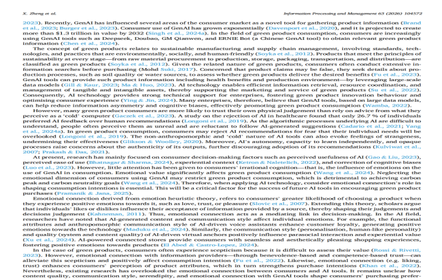该论文详尽探究了生成式人工智能工具的不同方面——尤其是内容质量、沟通风格以及额外功能——如何单独及共同影响消费者的情绪联系以及随后的绿色产品购买意向。该论文首次揭示了一个此前被忽视的机制,人工智能时代的消费者决策超越了单纯的理性决策,受到了人机交互的情感影响。