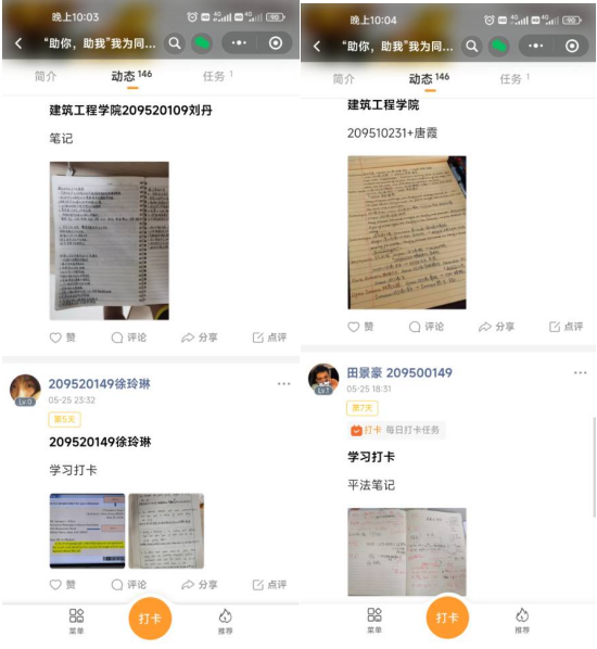 活动的主要内容为同学们每日在微信小打卡程序上进行学习打卡,上传当日学习笔记或学习心得完成当日打卡任务。同学们互相参考优秀笔记,相互学习,在活动过程中激发学习兴趣,从而形成优良的学习氛围,通过活动的开展和同学们每日打卡分享,让同学们互相学习、交流学习经验并达到自主学习的目的。