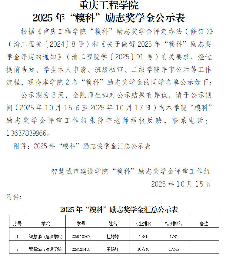 重庆工程学院2025年“糗科”励志奖学金公示表