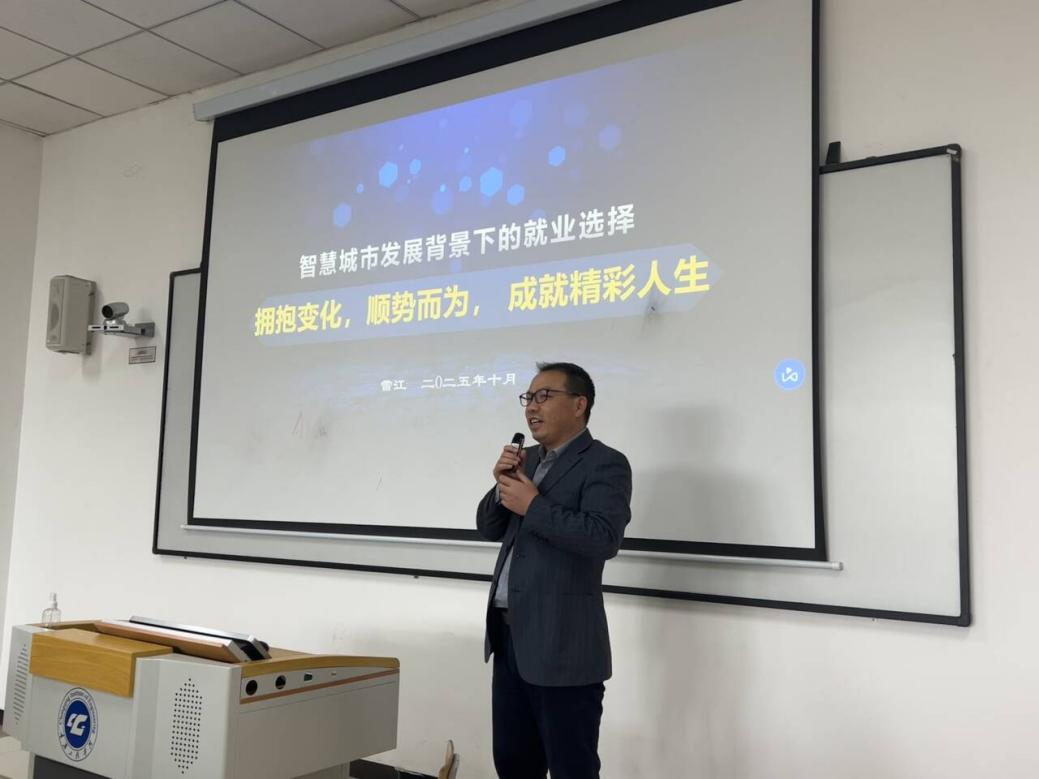 本网讯(文/图 胡璐玺)10月22日,智慧城市建设学院在南泉校区第六教学楼6304成功举办以“智慧城市发展背景下的就业选择-拥抱变化,顺势而为, 成就精彩人生”为主题的讲座,由学院雷江院长主讲,进行了一场干货满满的分享会。