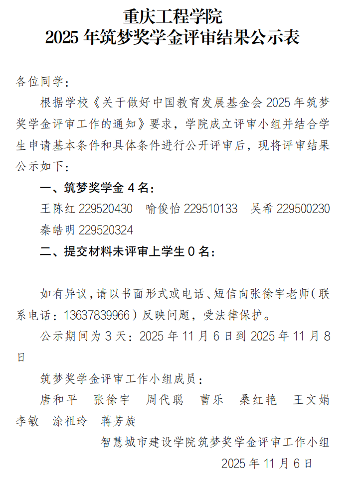 重庆工程学院2025年筑梦奖学金评审结果公示表