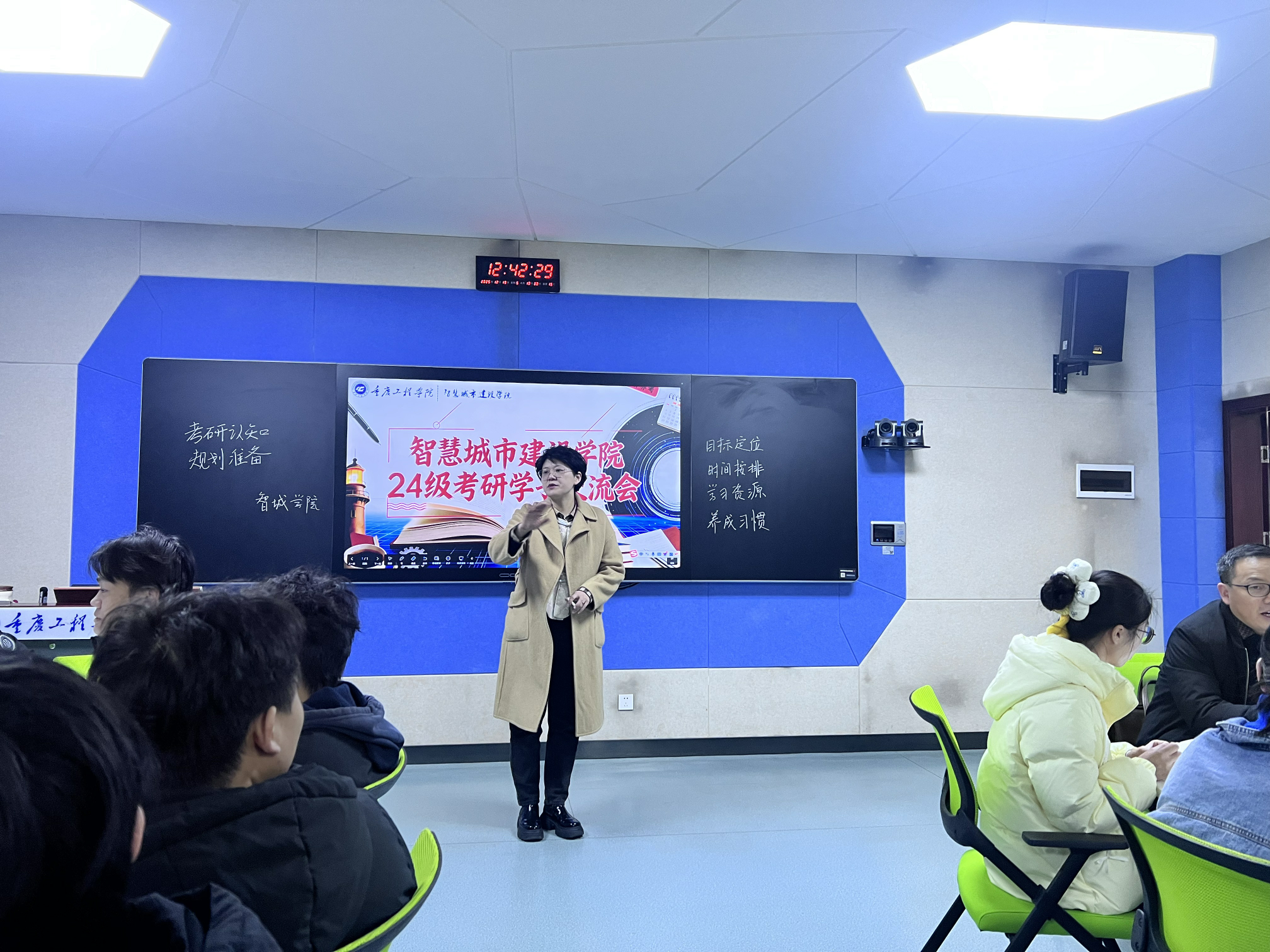 会上,雷江院长介绍了当前考研形势与各专业考研的实际情况。他指出,考研是学生提升专业能力、拓宽发展平台的重要途径,也是为未来投身智慧城市建设积蓄力量的关键一步。雷院长和学生一一交流,询问学生考研想法,并针对学生的想法详细给出了解答,分享了自身考研历程,也强调了考研对个人成长和专业发展的深远意义,鼓励同学们树立明确目标,科学规划备考路径。