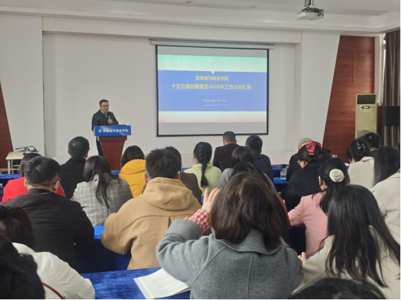 最后,雷江院长汇报了学院“十五五”规划概要,并对2026年工作计划进行了安排。关于学院“十五五”规划,他阐述了总体思路,明确总体目标为“审核评估指标全面达标;至2030年,将学院打造成为‘专业+AI’多学科交叉融合、特色鲜明且管理规范的二级学院”,并逐一细化了党的建设、人才培养、学科专业、师资队伍、协同创新、社会服务等六大方面的发展目标,同时对规划的主要板块和重点内容进行了详尽说明。关于2026年工作计划,他强调以学校2026年工作要点为指引,全面贯彻“两融一改”“六项行动”工作要求,针对高质量党的建设、专业转型与实施、教学改革、师资队伍优化与能力提升、学科科研及社会服务、学风建设、就业工作、入驻双桥校区等任务,逐一明确了目标、任务及预期成效。