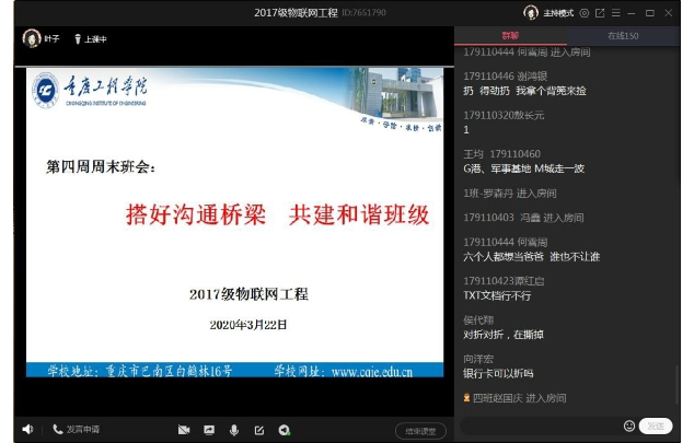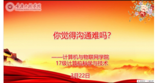 3月21日,为进一步增强班级凝聚力,创建和谐班级,使同学们之间能够团结互助、共同进步,计算机与物联网学院特别组织开展了“搭好沟通桥梁 共建和谐班级”主题班会活动,旨在使同学们能更好地掌握沟通技巧,在轻松愉快地氛围中感受到集体的温暖,化解之前出现的矛盾,并引导他们以一颗积极乐观的心来善待周围的同学,在以后的人生道路中能以更积极的心态融入集体、融入社会。