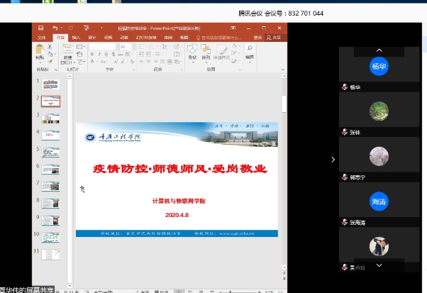 本网讯(文/图 罗桓)4月8日下午14时,计算机与物联网学院通过腾讯会议召开“疫情防控 师德师风 爱岗敬业”培训会,会议由党总支书记覃华伟主持。