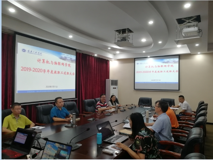 本网讯(文/图 罗桓)2020年7月11日下午,计算机与物联网学院在第七会议室召开了2019-2020学年度教职工述职大会。学校王琼花副校长、人事处李松柏老师亲临现场指导。