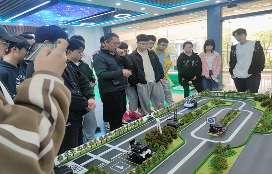 王朝卿老师向学生们介绍了中兴ICT实训基地各“5G+”互联互通项目。终端产品,包括电话机、传真机、发报机等,展示了早期模拟通信技术的成果;智慧交通沙盘,是物联网专业的主流应用场景,主要作用是展示及验证,学生在物联网实训室二次开发后,可在此沙盘进行验证;智慧医疗系统,除了物联网应用层展示之外,展厅采集数据可与云计算实训室数据互通,开展云计算与边缘计算实验;远程驾驶系统,实际上是一套仿真设备,模仿车辆驾驶舱,将机械动作调制成电信号,再通过通信网络由5G无线信号的方式发送,车辆接收到后将电信号还原成机械动作,实现远程驾驶;MR系统,即混合虚拟现实系统,数字媒体内容是从机架到机框到单板的展示,演示员在视觉上有身临其境的感觉。
