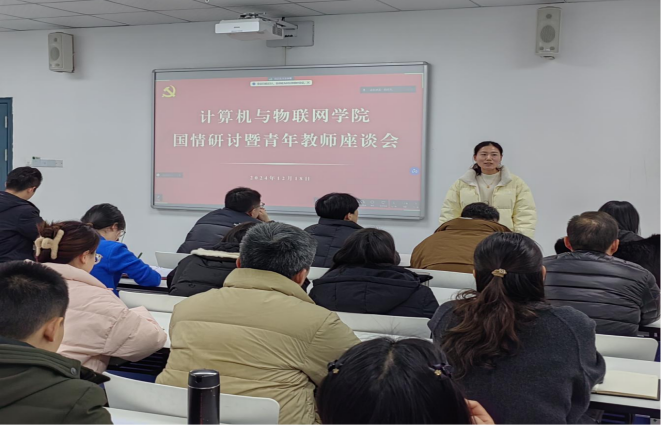 为深入了解访学教师和青年教师的思想动态和成长路径及需求,计算机与物联网学院于12月18日在第七教学楼1101会议室召开国情研讨暨青年教师座谈会。学院党总支书记黄涛、全体教师参加了会议。会议由党总支书记黄涛主持。