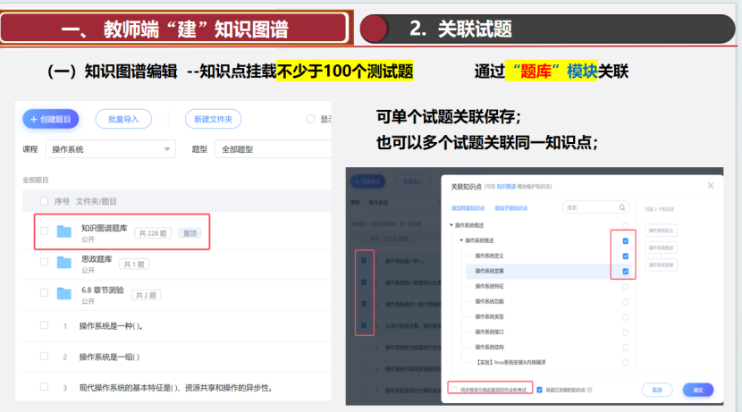 本次培训围绕“以学生为中心”的教育理念,着力改变传统“知识灌输”模式,转向关注“学生学得怎么样”,强调在教学中培养学生的综合能力与素养。知识图谱作为教学内容的可视化与结构化工具,支持教师通过多样化标签梳理课程知识体系,并为每个知识点关联不少于100项学习资源与测试题。教师可通过“章节”“资料”等模块灵活挂载视频、文档、试题等多元材料,构建系统化、层级清晰的学习资源网络,为学生提供丰富、有序的学习支持。