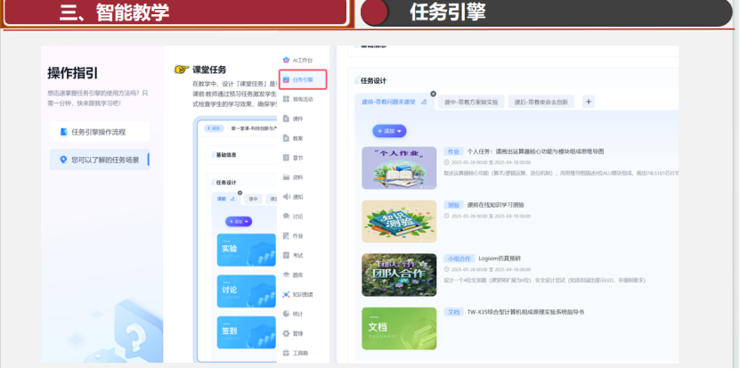 AI助教作为智能教学支持系统,依托结构化的知识库与问答库,结合任务引擎与智能体技术,能够自动响应学生提问、推送个性化学习任务、引导探究式学习,在减轻教师重复性工作的同时,增强学生学习的互动性与自主性,形成“教师引导+AI辅助+学生主体”三元协同的教学新样态。
