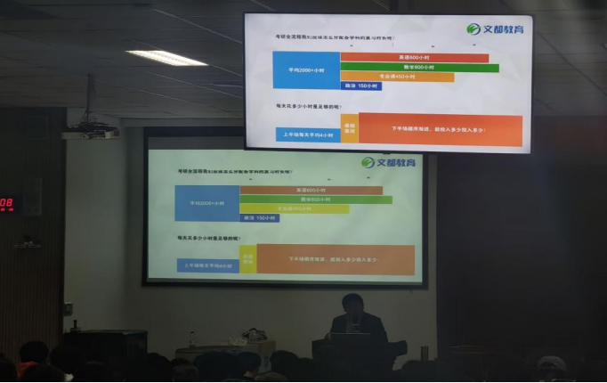 宣讲会以“梦想,要说出口,才强大!我要考研啦!”的励志口号开启,迅速点燃现场学生的考研热情。讲师围绕考研全流程复习规划展开核心分享:从学科时间分配维度,明确英语需投入 600 小时、数学 800 小时、专业课 450 小时、政治 150 小时,累计复习时长需达 2000 + 小时,从阶段时间管理维度实现循序渐进的高效备考。