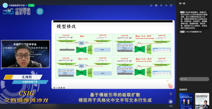 为进一步拓展科研视野,提升科研创新能力,重庆工程学院计算机与物联网学院智慧农业工程研究中心于2025年10月21日晚组织中心教师与学生开展了一次在线学习交流活动。本次学习以中国图象图形学学会(CSIG)主办的“文档图像微沙龙”直播报告为依托,围绕“基于模板引导的级联扩散模型用于风格化中文手写文本行生成”这一主题展开深入学习与讨论。