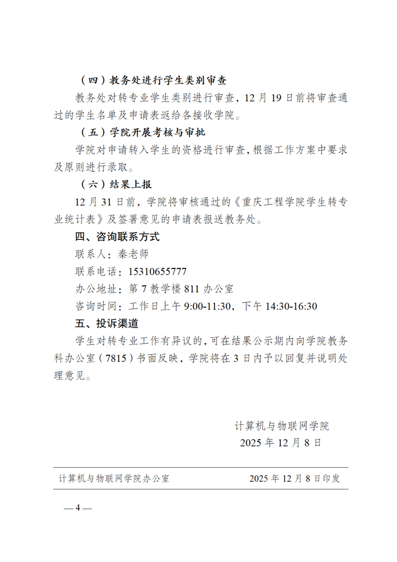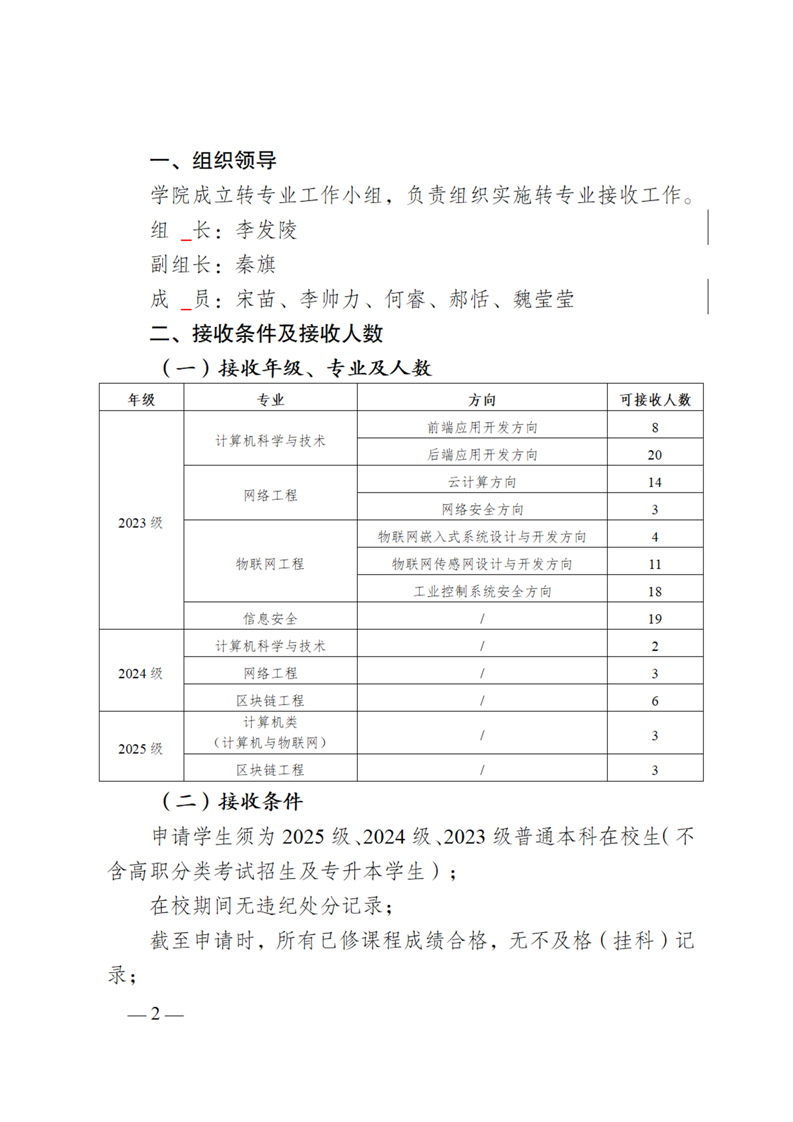 计算机与物联网学院 2025—2026学年第一学期本科生转专业工作方案