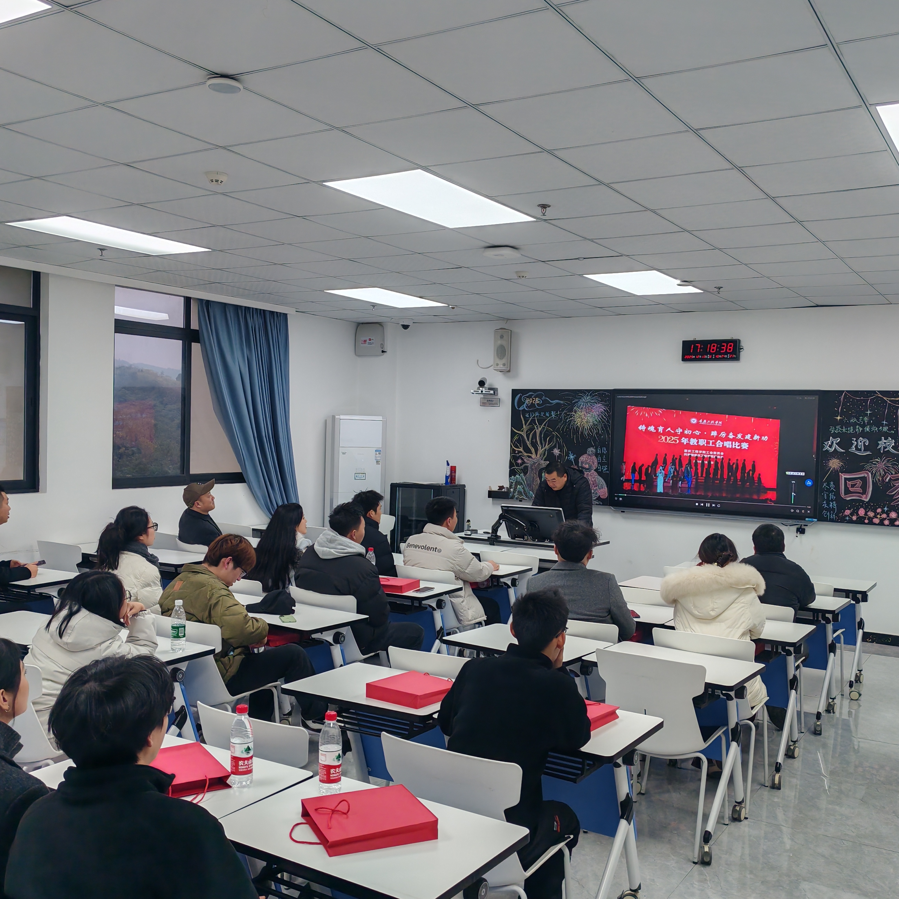 座谈会尾声,全体与会人员移步至7710教室,共同参与“重返课堂”主题活动。当学院教师合唱比赛的温馨画面在屏幕上缓缓播放,当熟悉的校园歌曲《香樟情怀》旋律响起,校友们与师生代表齐声合唱,歌声里满是对青春岁月的眷恋、对母校恩师的感恩。悠扬的旋律穿越时光,将现场氛围推向高潮,仿佛又回到了那些埋首苦读、并肩奋斗的日子。活动最后,全体代表在第七教学楼前合影留念,镜头定格下一张张笑容洋溢的脸庞,也定格了这场“双向奔赴”的温暖之约。