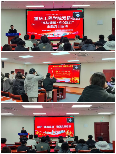为强化党员身份意识与责任担当,坚定理想信念,2025年12月18日重庆工程学院双桥校区计算机与物联网学院组织开展了“宪法铸魂・初心践行”主题党日活动,双桥校区各学院学生支部100余名师生党员以“线上+线下”相结合的形式参加。