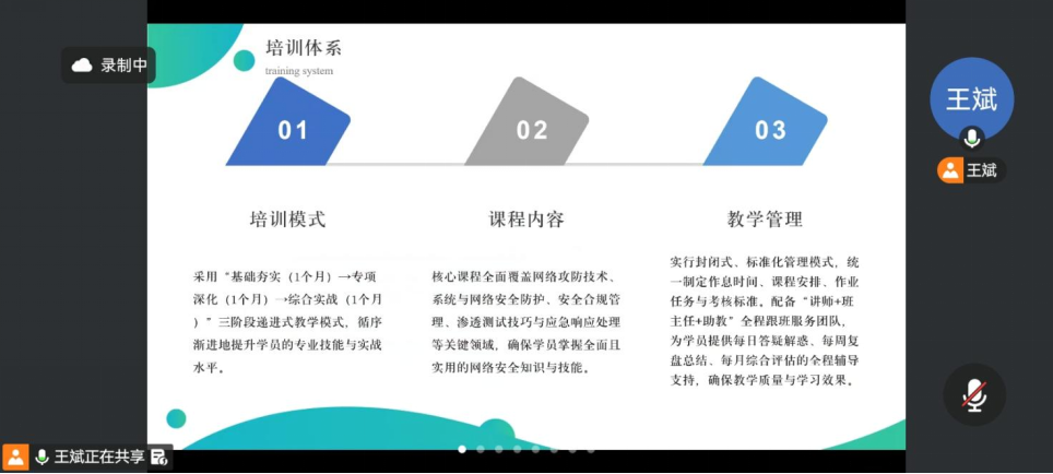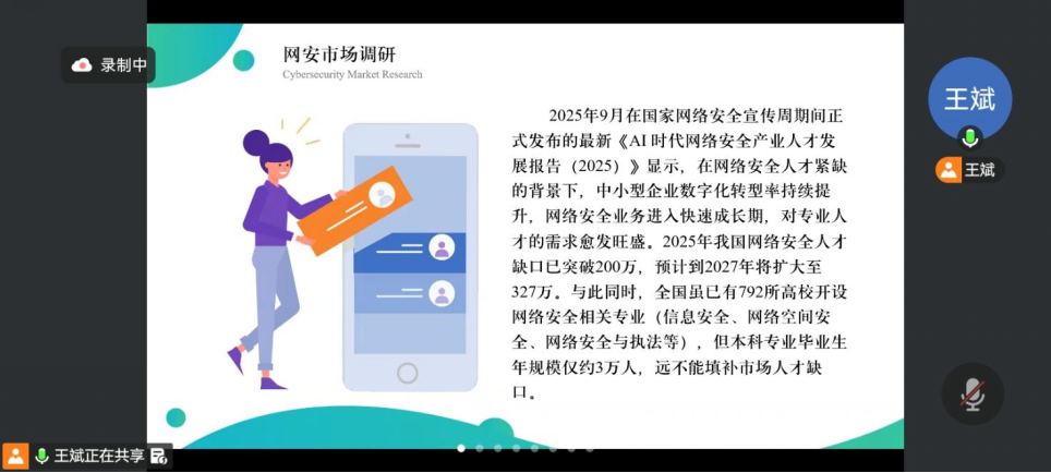 本网讯(图/文 魏克非)2026年3月11日,晚上19:30点到20:40点,我院联合重庆易阅科技有限公司在腾讯会议上召开了招聘简章会议,主讲人王经理为线上学生分析目前大学生就业压力和就业形势。并且指出国家对网络安全发布的新规定,表明当前社会安全网络工程师大量缺乏,并且针对国内无论大小企业对企业网络安全的重视然后并进行人才培养方案。