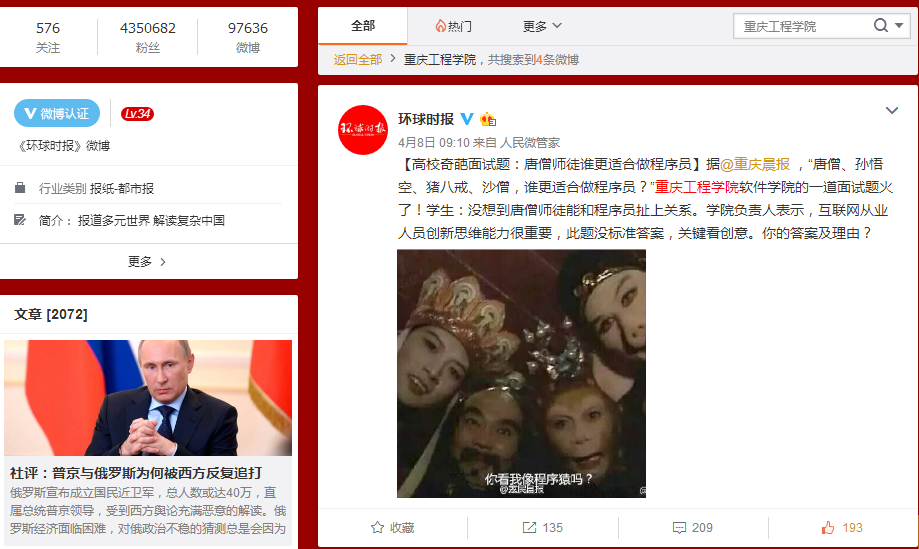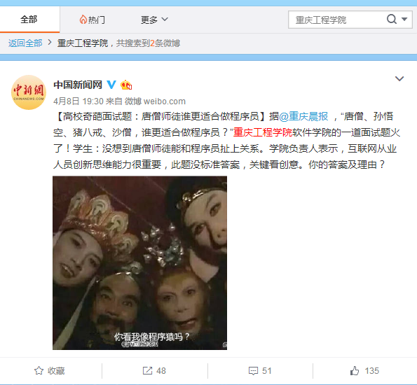 本网讯(党委宣传部)据@重庆晨报,“唐僧、孙悟空、猪八戒、沙僧,谁更适合做程序员?”重庆工程学院软件学院的一道面试题火了!学生:没想到唐僧师徒能和程序员扯上关系。学院负责人表示,互联网从业人员创新思维能力很重要,此题没标准答案,关键看创意。你的答案及理由?——并喜获人民日报、中国新闻网、中国网、网易、重庆市教委等官博、门户网站的转载报道。