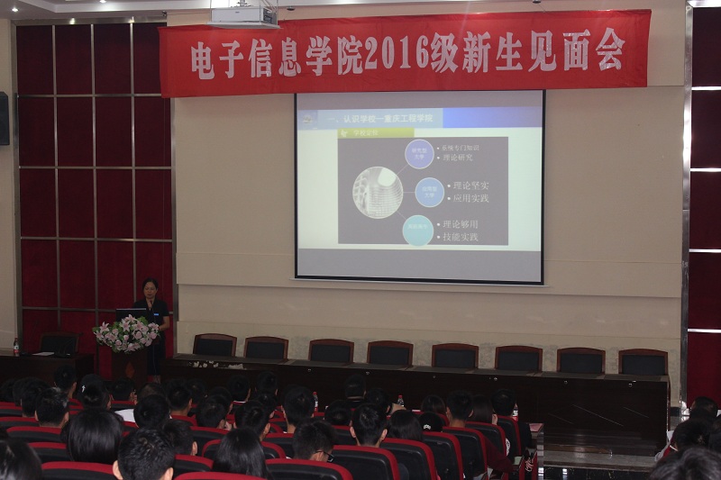 本网讯(电子信息学院 刘顺江)开学季,南泉校区电子信息学院迎来了200余名新同学。为让新生更好地适应大学生活,增强对学校、学院及所学专业的认识,电子信息学院于9月5日上午在行政楼阶梯教室隆重举行2016级新生见面会。企业界代表、重庆计算机学会理事、华三联盟企业重庆瑞萃德科技有限公司董事长曹怀志先生,电子信息学院院领导和老师,与学生们齐聚一堂,交流互动。