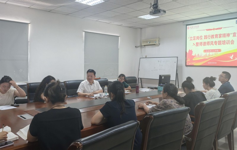 本网讯(文/图 马克思主义学院 刘爽)为全面落实《关于加强和改进新时代师德师风建设的意见》要求,引导全院教师自觉践行教育家精神,10月10日下午,马克思主义学院在学院会议室401组织开展“立足岗位践行教育家精神”宣讲会暨师德师风专题培训会。学校党委书记、马克思主义学院第一书记陈长虹出席,学院全体思政课教师参加。会议由学院党总支书记王巧玲主持。