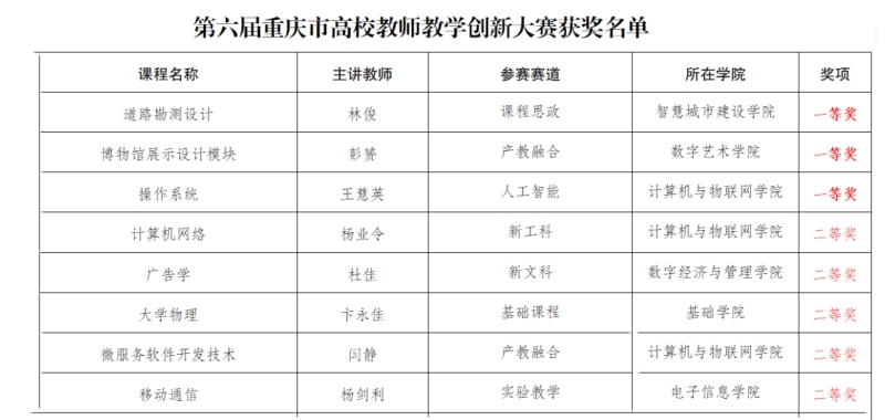 智慧城市建设学院林俊团队(课程思政赛道)、数字艺术学院彭赟团队(产教融合赛道)、计算机与物联网学院王慧英团队(人工智能赛道)荣获一等奖。这三支团队将代表我校参加国赛选拔赛,向更高层次的荣誉发起冲击。此外,计算机与物联网学院杨业令团队、数字经济与管理学院杜佳团队、基础学院卞永佳团队、计算机与物联网学院闫静团队、电子信息学院杨剑利团队荣获二等奖。