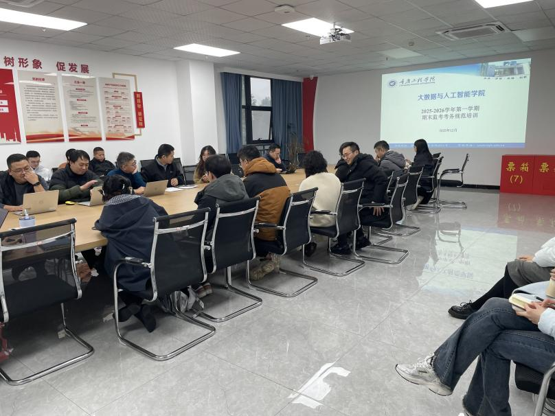 本网讯(文/图 大数据与人工智能学院 傅沙沙)12月30日13:00至14:00,大数据与人工智能学院通过线上线下相结合的方式,召开了“2025-2026学年第一学期期末监考考务规范培训会暨教学档案归档培训会”。会议由教学副院长廖宁主持,教务科全体人员及南泉校区全体专任教师现场参会,辅导员及双桥校区教师线上参会。
