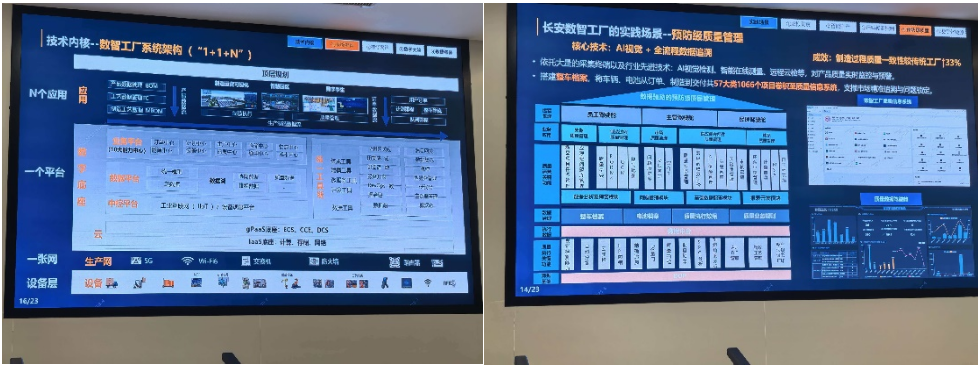 参观过程中,长安汽车数字工厂运营中心高级经理戴翔向谭光柱副教授详细介绍了数字工厂的整体建设情况与运营模式,系统阐释了当前数智工厂的系统架构设计理念、技术实现路径以及在数据集成、流程协同等方面的创新实践。他还重点分享了长安汽车在数据质量管理方面的制度建设、技术手段与实战经验,强调了高质量数据在智能制造、精准决策中的核心作用。