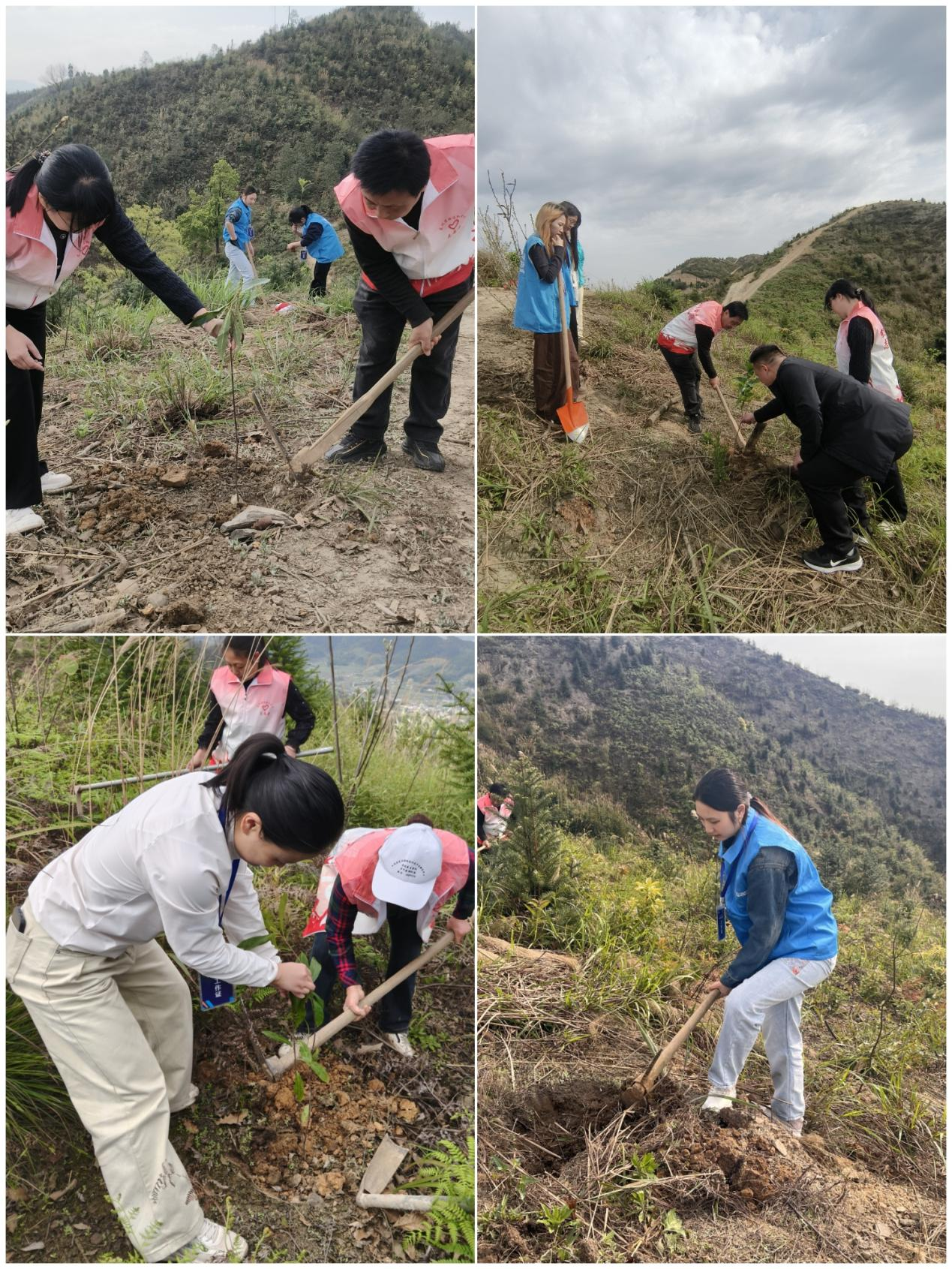 会后,志愿者队伍整装待发,驱车前往铜锣山山顶种植区域。车行山间,春日的山城风光尽收眼底,志愿者们满怀热忱,带着植树工具与嫩绿的木荷苗,奔赴绿意重生的希望之地。