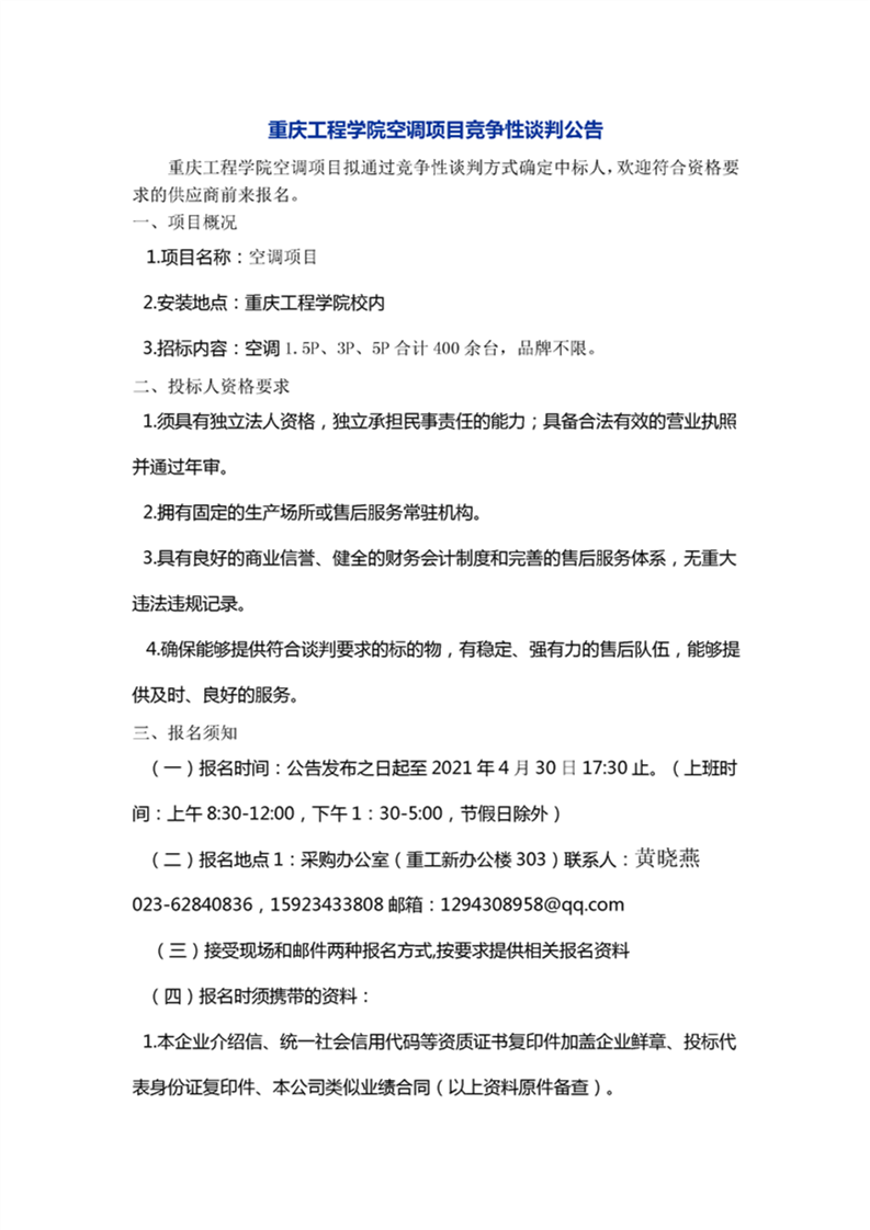 重庆工程学院空调项目竞争性谈判公告