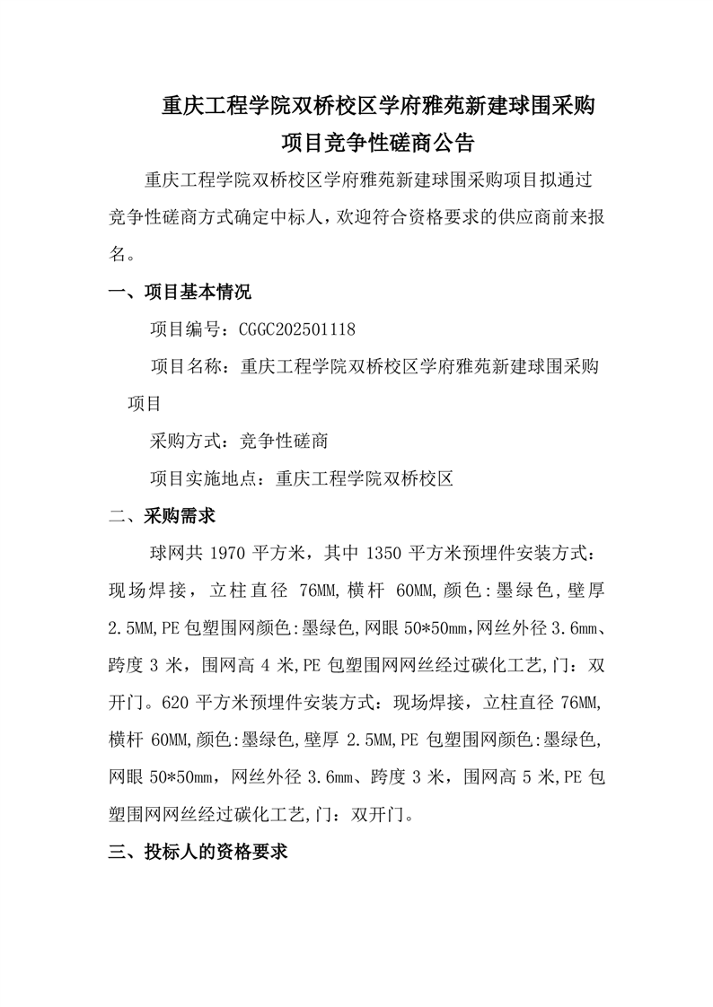 重庆工程学院双桥校区学府雅苑新建球围采购 项目竞争性磋商公告