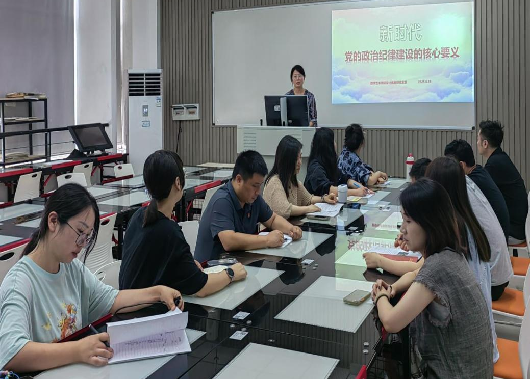 晁洪娜同志以“完善中国特色社会主义法治体系”为主题,领学党的二十届三中全会精神,系统阐释了完善法治体系的重大意义、必须坚持的正确方向,以及法治在引领、规范、保障社会发展中的核心作用。与会党员围绕《中国共产党纪律处分条例》中的“政治纪律红线”,探讨从三个方向将法治精神与纪律意识融入教育教学。一要筑牢政治根基,在课程设计中嵌入法治案例,引导学生理解中国特色社会主义法治体系与党的纪律的统一性;二要划清纪律底线,结合艺术创作伦理,明确学术与教学中的政治纪律要求,防范意识形态风险;三要发挥引领作用,以法治思维规范教学管理,推动师德师风与党纪国法协同建设。