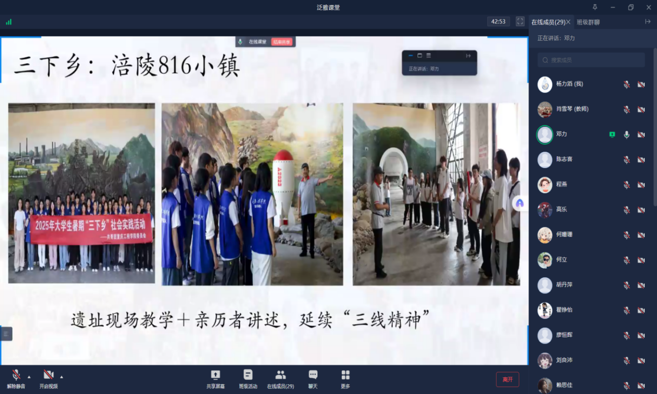 活动伊始,党员代表依次进行暑假社会实践分享。各位党员代表们结合自身经历,从不同角度展现了实践中的收获与感悟:周楠同志投身乡村助教,在克服教学资源有限的挑战中,用课程辅导与兴趣课堂点亮孩子们的求知眼睛,字里行间满是对乡村教育的热忱;肖雪琴同志涉足基层服务与行业调研等多个领域,借助图片素材,生动呈现了运用专业知识解决实际问题的过程,让线上参与的党员们深切体会到实践的多样价值;邓力同志深入基层一线,在乡村志愿服务与政策宣传中,用心学习与群众沟通的技巧,助力解决实际困难,彰显了党员扎根基层、服务群众的担当。