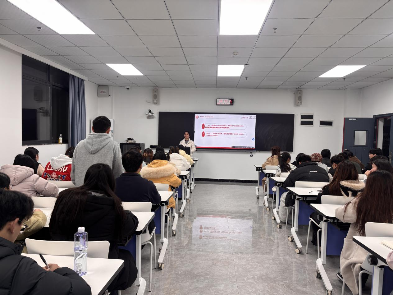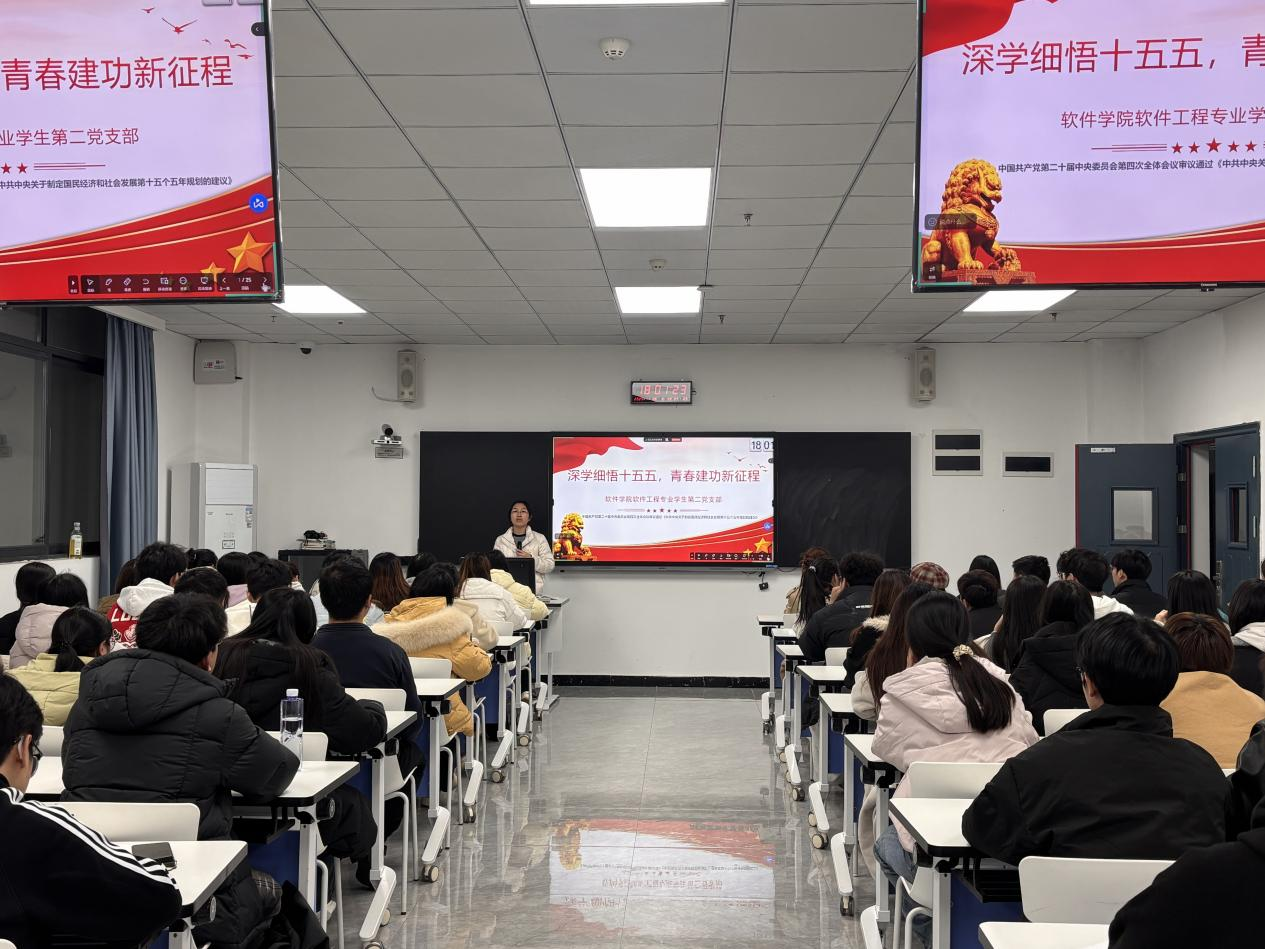 本网讯(文/图 软件学院 周楠/李正杰)为深入学习“十五五”规划的建议,引导学生党员把握国家发展战略布局,切实增强使命担当,软件学院软件工程专业学生第二党支部于11月26日在第七教学楼1202教室开展“深学细悟‘十五五’,青春建功新征程”主题党课。支部全体23级、24级学生党员、发展对象及入党积极分子共80余人参加。