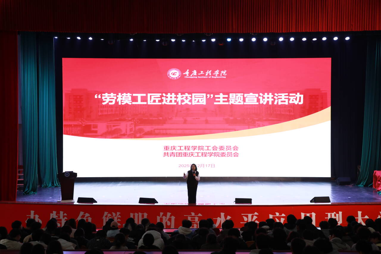 (文/校工会 周黎 图/大学生记者团)为深入学习贯彻习近平新时代中国特色社会主义思想,大力弘扬劳模精神、劳动精神、工匠精神,激励青年学子坚定理想信念、勇于创新创造,12月17日下午,由校工会与校团委联合主办的“劳模工匠进校园”主题宣讲活动在南泉校区学术报告厅举行。本次活动以“时代召唤 青年担当”为主题,特邀重庆市劳模、工匠人才创新工作室负责人宗君女士作专题分享。活动在重庆市教科文卫体工会的悉心指导和大力支持下顺利开展,全校800余名学生代表参加活动。