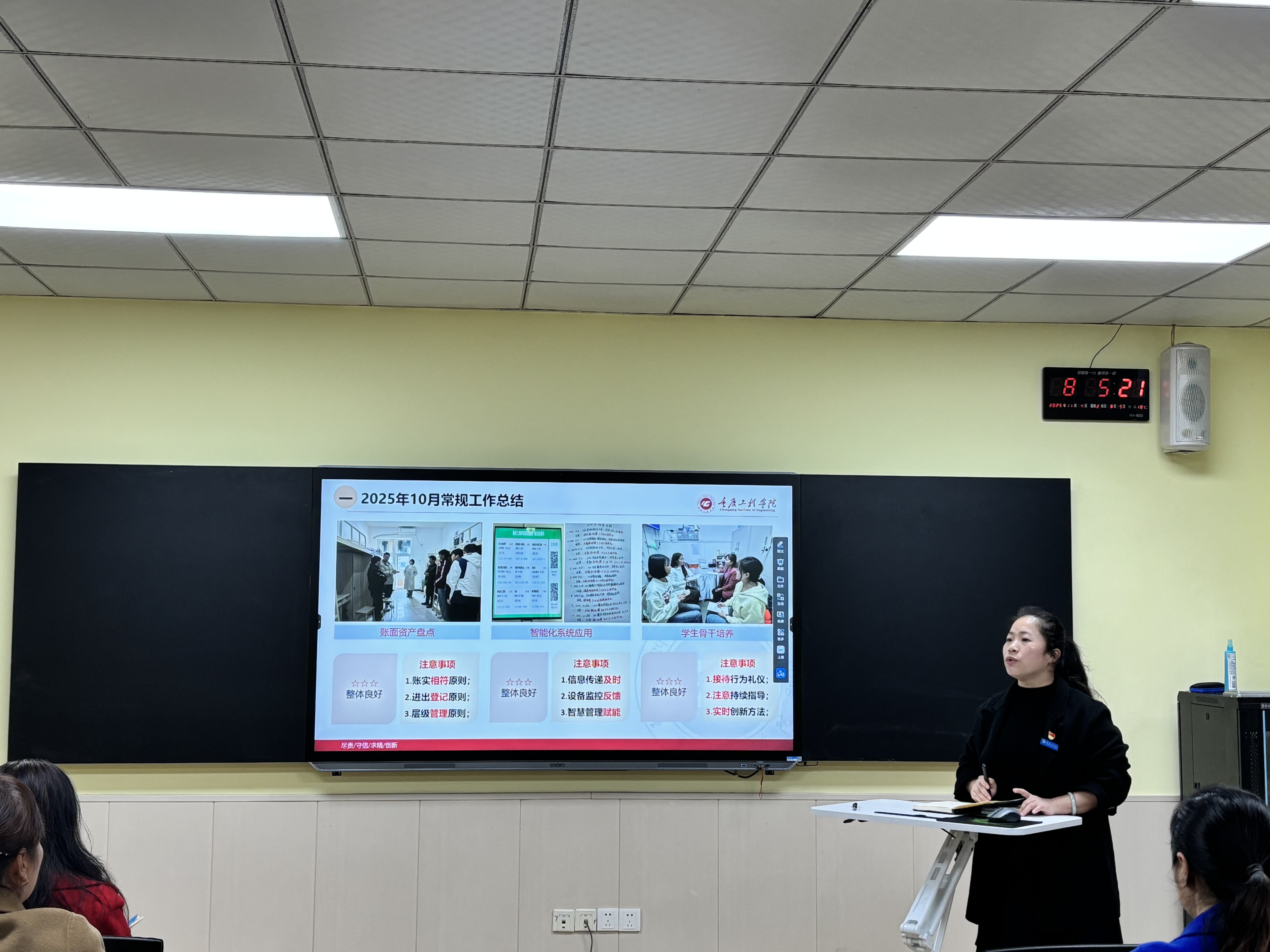 会议上,祝毅系统总结了宿舍管理员10月份工作,公示了日常工作检查结果与绩效考评,并对存在问题进行复盘。同时,会议解读了“文明修身节”活动方案与优秀管理员评选标准,以激发工作热情,培育文明风尚。聚焦11月工作重点,会议部署相关核心任务。在随后开展的专项培训中,会议就卫生评比的通报流程、考评标准,以及火灾案例、预防与应急流程进行了详细讲解,进一步提升管理员的实务能力。