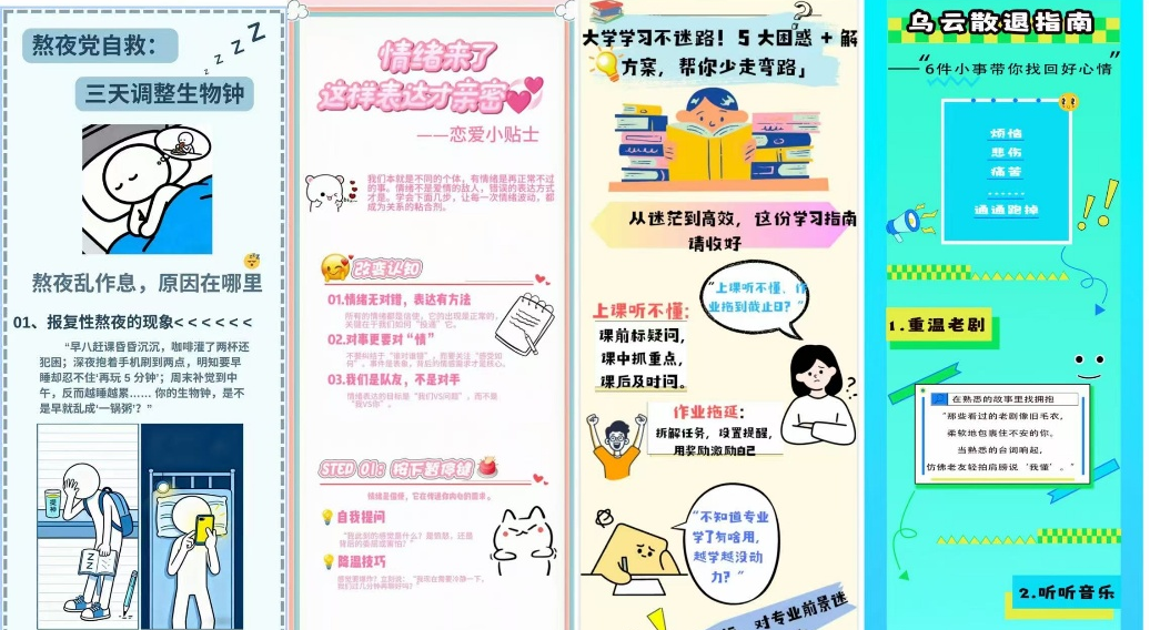 “暖心贴士”海报创作比赛让同学们围绕大学生学习、生活、就业、交友、恋爱等方面的心理困惑和成长烦恼展开,并自行给出针对性建议,每组作品上限为30个。最终共337个学生参与作品的制作,收集了233组作品。按照参赛作品总数的前10%进行评奖,共23组、28个学生获奖,奖金为50/作品。海报创作在激发了同学们各种创新思维的同时,也让同学们对自身成长的问题与烦恼有了更清晰的认识,帮助他们提高了问题解决能力。