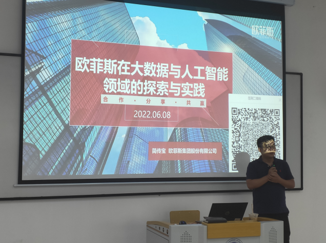 简传宝老师先通过自身经历引入,向与会师生介绍了大数据与人工智能领域的重要性及大数据与AI技术发展历程。讲座以欧菲斯公司从创业到转型的过程以及公司的行业地位、战略路径展开,结合欧菲斯集团的业务技术进行了深入浅出的讲解,还涉及到了大数据与人工智能方向的实践、机器视觉、图象识别等大数据平台技术。