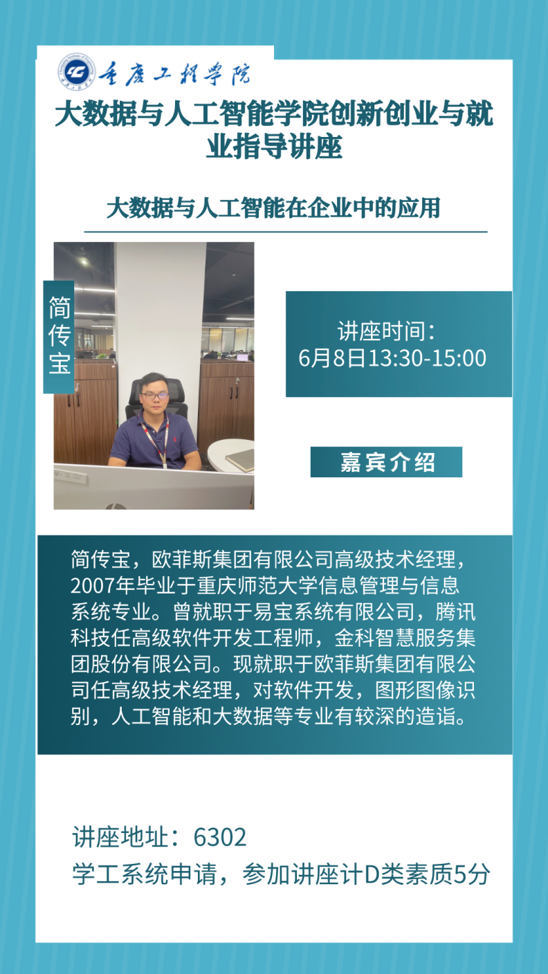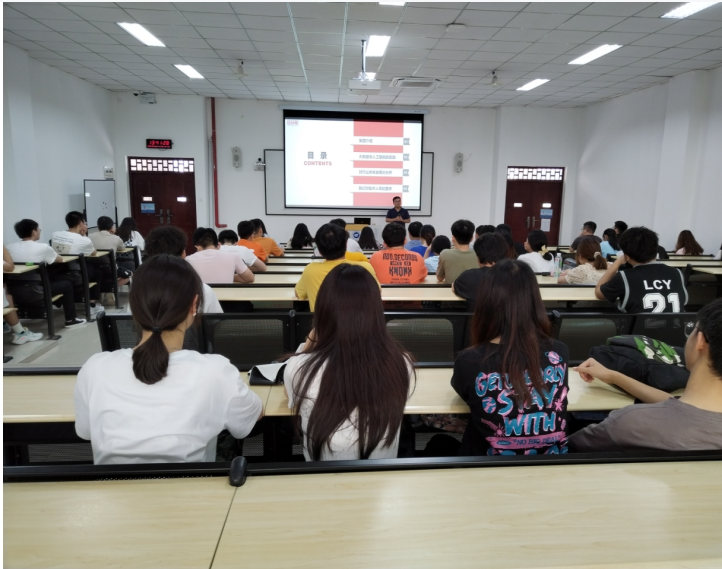 本网讯(文/图 张庆)6月8日下午,我校大数据与人工智能学院邀请到了欧菲斯集团有限公司高级技术经理简传宝老师,在13:30展开“欧菲斯在大数据与人工智能领域的探索与实践”主题就业讲座。我院就业科、及部分专业教师参加了本次讲座,大数据学院学子们100余人参加。