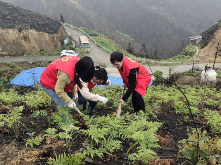 2022年夏,重庆多地山火引发的重大灾害对生态环境造成了严重破坏,支部学生党员同志参与了巴南新玉村山火救援志愿服务。山火留下的痕迹历历在目,随处可见已经碳化的残枝,腐化的树根深埋在土里,支部书记王芳同志组织带领支部前往新玉村开展灾后重植。同志们通力合作,在预设的土坑里除草、种下几十株香樟和红枫树苗、回填浇水,一丝不苟,为新玉村的生态环境恢复贡献出一份力量。