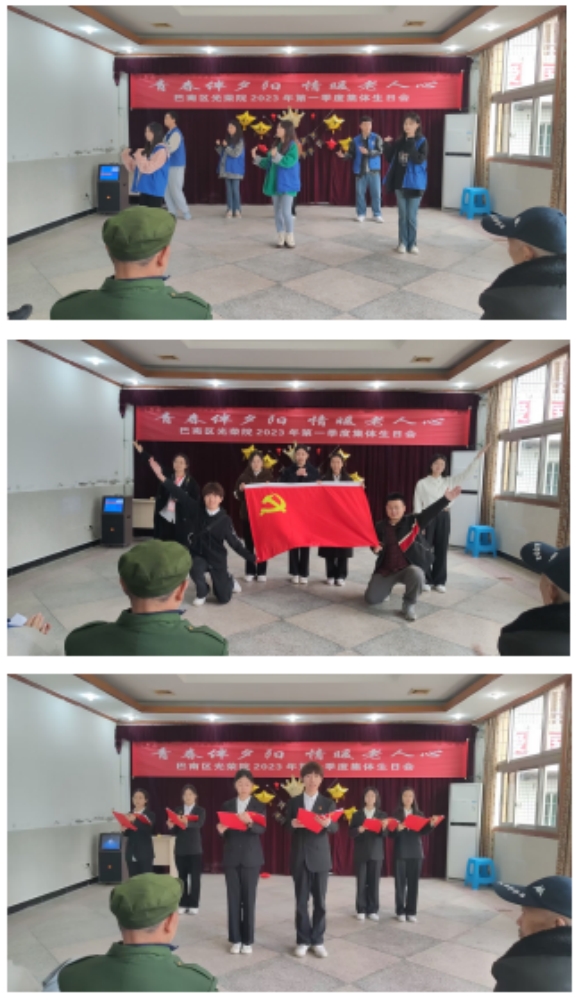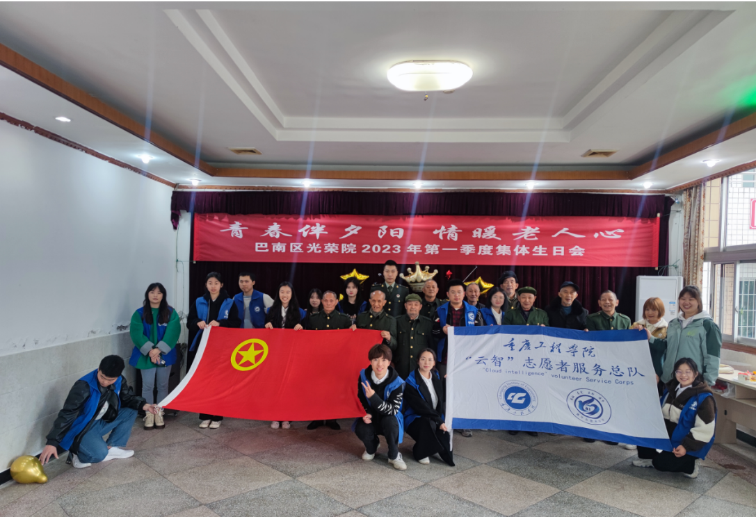 (文/图 软件与人工智能学院 郑晓龙)“青春伴夕阳,情暖故人心”,为了让老人感受温暖,提升幸福感,3月29日,软件与人工智能学院云智志愿者协会联合学生党员实践教育分中心、广场舞社团为巴南区光荣院退休老军人及军烈亲属举办了一场集体生日会。本次活动由重庆春语社会服务中心主办,我院云智志愿者协会承办,学生党员实践教育分中心及广场舞社团协办。
