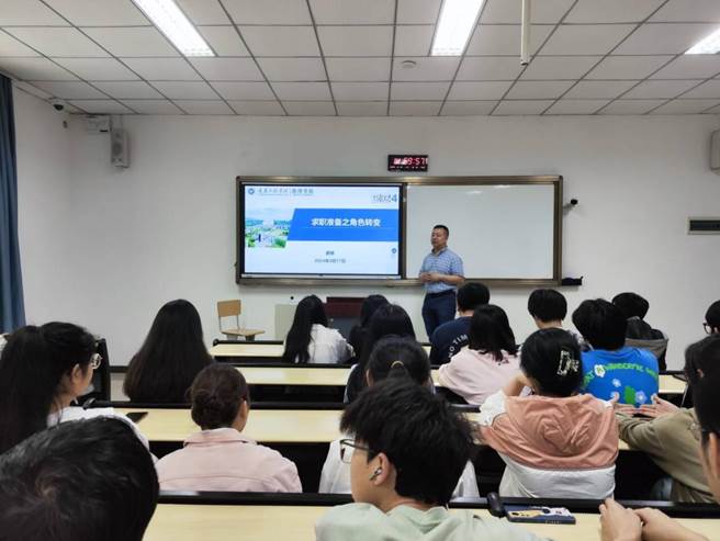 活动伊始,滕攀老师结合自身多年的招聘经验,深入剖析了当今职场对求职者的要求和期望,强调了角色转变不仅仅是环境的改变,更是心态、能力和责任感的全面升级。他鼓励同学们要勇敢面对挑战,积极调整心态,不断提升自己的能力和素质,以适应职场的需求。紧接着,滕攀老师通过分享多位学长学姐的求职经历,为大家提供了宝贵的参考和启示,使同学们不仅了解到了求职过程中的细节,还深刻体会到了角色转变的重要性。