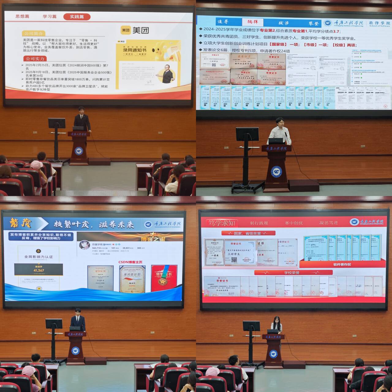 此次答辩会共有四位优秀候选人参与展示。王伟铭同学以“心怀理想,逐光而行”为主题,展现了在学业、竞赛与实习中的全面突破;代文豪同学以“心向往之,行将必至”为主线,分享了在思想引领、学术研究与组织服务中的成长历程;陈博恒同学围绕“根深叶茂,逐梦成林”,讲述了从竞赛新手到国际赛事获奖者的蜕变之路;闵思涵同学则以“道阻且长,行则将至”为信念,展示了在专业学习、志愿服务与学生工作中的卓越表现。提问环节中,评委老师们围绕“以赛促学”的实践成效与专业学习的平衡之道,与候选人进行了深入交流。针对竞赛经历如何反哺课堂学习、项目成果如何转化为学术积累等关键问题,各位候选人结合自身参与ACM竞赛、大创项目及软著申请等经历,阐述了如何在竞赛中深化理论知识、在实践中巩固专业基础,展现了软院学子学以致用、知行合一的综合素养。