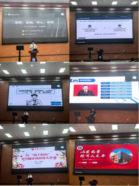 宣讲会上,软件学院软件工程训练中心葛亮、软件技术教研室冷亚洪、软件技术教研室孟高原、数字孪生产业学院虚拟现实技术系刘啸天、陈婷、数字孪生研究所任然、辅导员李晨燕老师围绕“立足岗位,围绕践行教育家精神”作主题宣讲。7位老师分别围绕“尽职、尽能、尽心、尽责-立足岗位、完善自我”“弘扬教育家精神,争做新时代‘大先生’”“越努力越幸运”“立足岗位践行教育家精神”“以‘两个假如’书写辅导员的育人答卷”等主题,从工作经历、个人成长、教育心得、育人收获等方面进行分享交流,达到了发挥榜样引领,传递教育初心的目的。