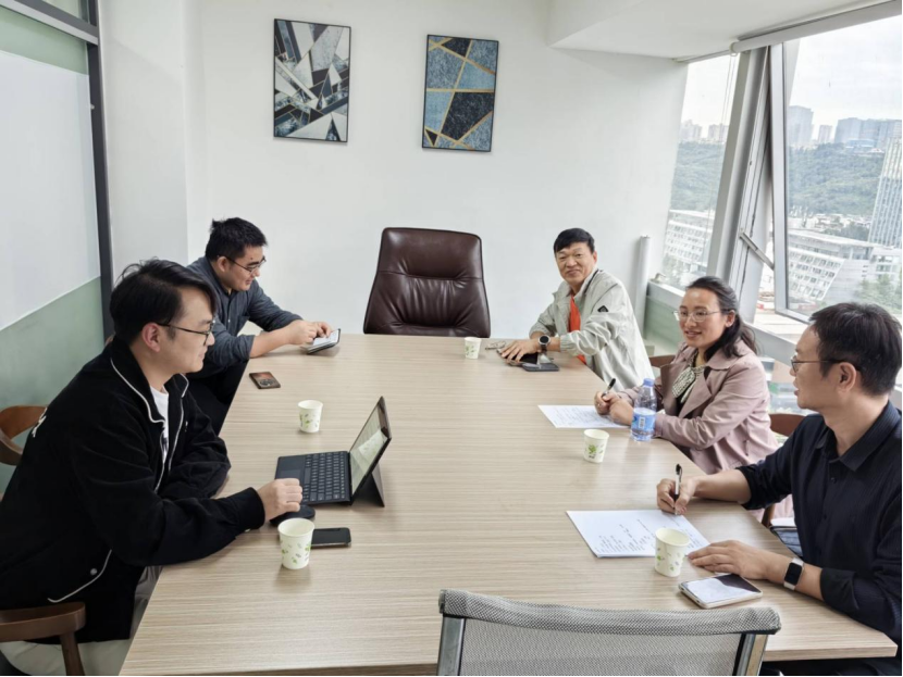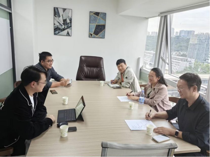 交流会伊始,焦润健总经理详细介绍了公司主营业务、核心产品及以往与重庆理工,重庆大学等高校合作开展科研项目的成功案例。随后,唐浩坤副院长阐述了本次走访的主要目的,即推动校企双方在2026年市自科基金项目上的联合申报事项。张小川教授结合其在重庆理工大学担任科研副院长期间积累的校企合作经验,提出从企业生产实践中挖掘共性科学问题,共同凝练研究方向。谭凤副教授则简要介绍了她在知识图谱、测试用例自动生成等方向的研究进展,并咨询了将其研究成果应用于关键企业智能设计测试云平台服务中的可行性。