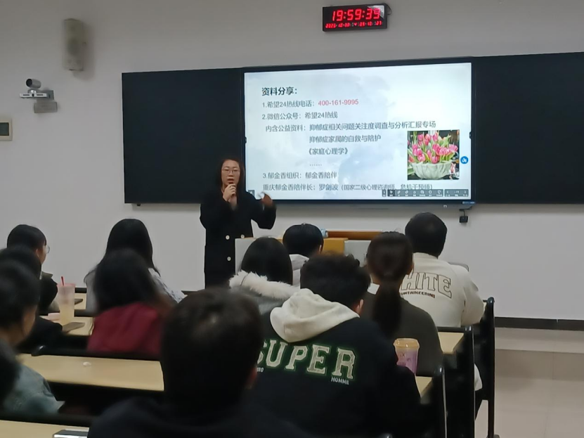 活动伊始,同学们扫码签到后有序入座,随后沉浸式跟随影片主角宋一鲤的救赎之旅,感受抑郁症患者在麻木与刺痛间的内心撕扯,以及余小聚带来的温暖治愈力量。影片展示了生命的脆弱和美好,更教会同学们如何面对困境,如何热爱生活。观影结束后,现场围绕“哪段情节让你产生共鸣”“主人公应对困难的方式有何启发”等问题展开互动,同学们结合自身经历分享感悟,进一步理解“抑郁症是医学疾病,与人性弱点无关”的科学认知。为进一步帮助同学们掌握心理健康知识、获取专业帮助渠道,胡老师还进行了抑郁症科普与资源分享,不仅详细讲解抑郁症的核心症状,还推荐了“希望 24 热线(400-161-9995)”、“郁金香陪伴”等资源,同时推荐了央视纪录片《我们如何对抗抑郁》,最后并引导大家在便签纸上记录“生命中的小美好”,在交流与书写中释放情绪、汲取勇气。