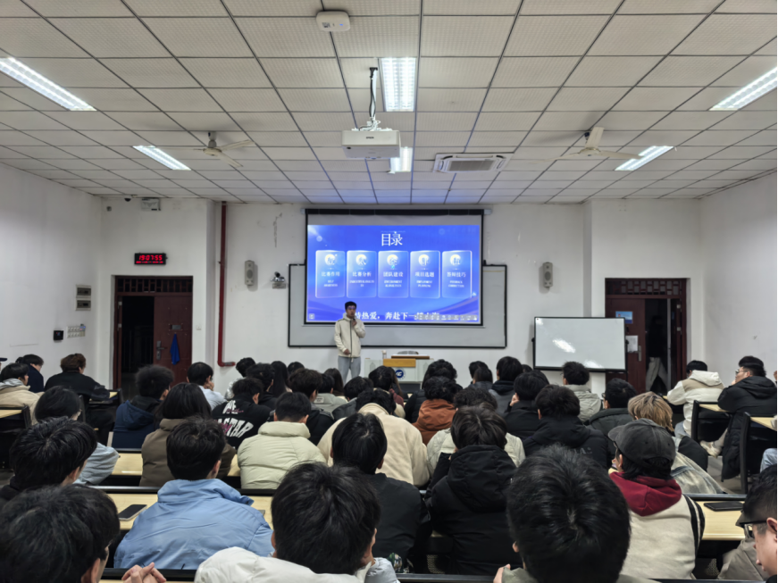 在经验分享环节,赖桥同学结合自身参与多项学科竞赛的丰富经历,从目标设定、任务分解、资源利用到团队协作等多个维度展开深入讲解。他特别提到,面对技术挑战时应善于整合学术资源并主动寻求导师指导,同时强调了团队内部明确分工与高效沟通的关键作用,为有意参赛的同学提供了清晰路径与实用策略。