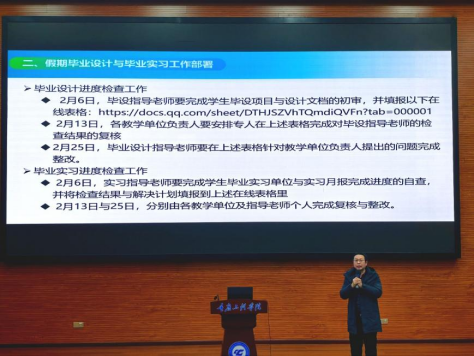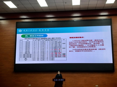 学院各分管领导分别作寒假及开学期间工作安排。其中,李华平副院长就下学期授课准备、专业监测、教改项目申报等作重点安排。唐浩坤副院长主要结合假期毕业设计与毕业实习工作推进、科研项目孵化和申报准备、第二课堂软件设计大赛项目遴选及决赛准备等工作进行部署。刘子菱书记通报了学院2025届毕业生就业工作整体情况以及就业经费使用明细、团队及个人奖励等情况,并详细安排布置寒假期间毕业生实习就业跟进指导和以及访企拓岗,要求老师们要加强学生关怀,深入了解学生当前状况,做到台账清、家底明、指导实,会上还对班导师假期在学生竞赛指导、班级学情分析等方面工作进行安排。最后刘书记结合学校对学院班子抓发展、抓质量、抓队伍、抓落实的总体要求,从学院2026年目标任务、质量跃迁、成果导向、团队赋能等方面指出后学学院努力方向,并勉励老师们同心协力,推进学院高质量发展。